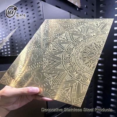 Les motifs gravés sont créés en appliquant sélectivement un film protecteur résistant aux acides sur des zones désignées et en gravant à l'acide les zones non protégées. La gravure élimine une fine couche d'acier inoxydable, changeant la couleur en un gris argenté terne et rugosant la surface, ce qui peut être contrasté avec le meulage, le super miroir ou d'autres finitions pour créer des milliers de variations. La finition gravée peut également être colorée avant ou après la gravure. Elle est largement utilisée pour les applications de décoration, telles que les portes d'ascenseur, les panneaux muraux, les corniches et les garnitures.